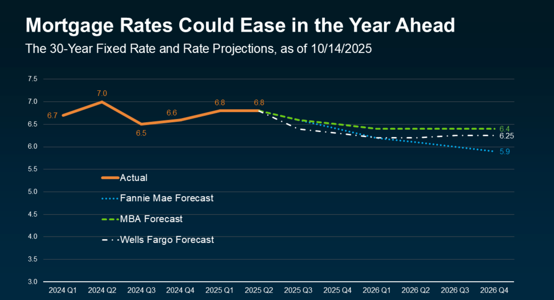 Rates won’t fall overnight — it’ll be a steady, stair-step process with occasional bumps along the way as new economic data is released. But overall, experts anticipate average rates settling in the low 6s to possibly high 5s by late 2026.